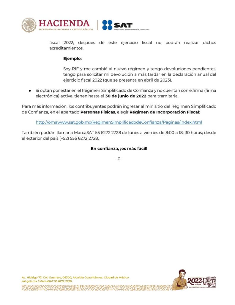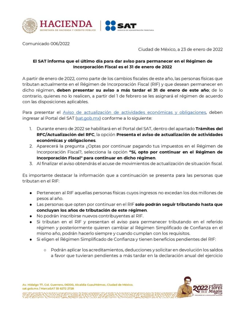 Estimados clientes, les recordamos que las personas físicas que deseen permanecer en el Régimen de Incorporación Fiscal deberán presentar un aviso ante el Servicio de Administración Tributaria a más tardar este 31 de enero.