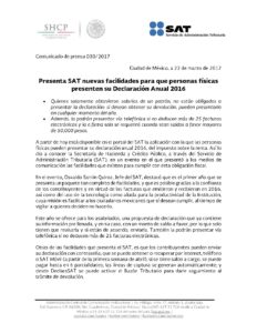 A partir de hoy está disponible en el portal del SAT la aplicación con la que las personas físicas pueden presentar su declaración anual 2016, del impuesto sobre la renta. Así lo dio a conocer la Secretaría de Hacienda y Crédito Público, a través del Servicio de Administración Tributaria (SAT), en un evento en el que presentó a los medios de comunicación las facilidades que existen para cumplir con esta obligación fiscal.