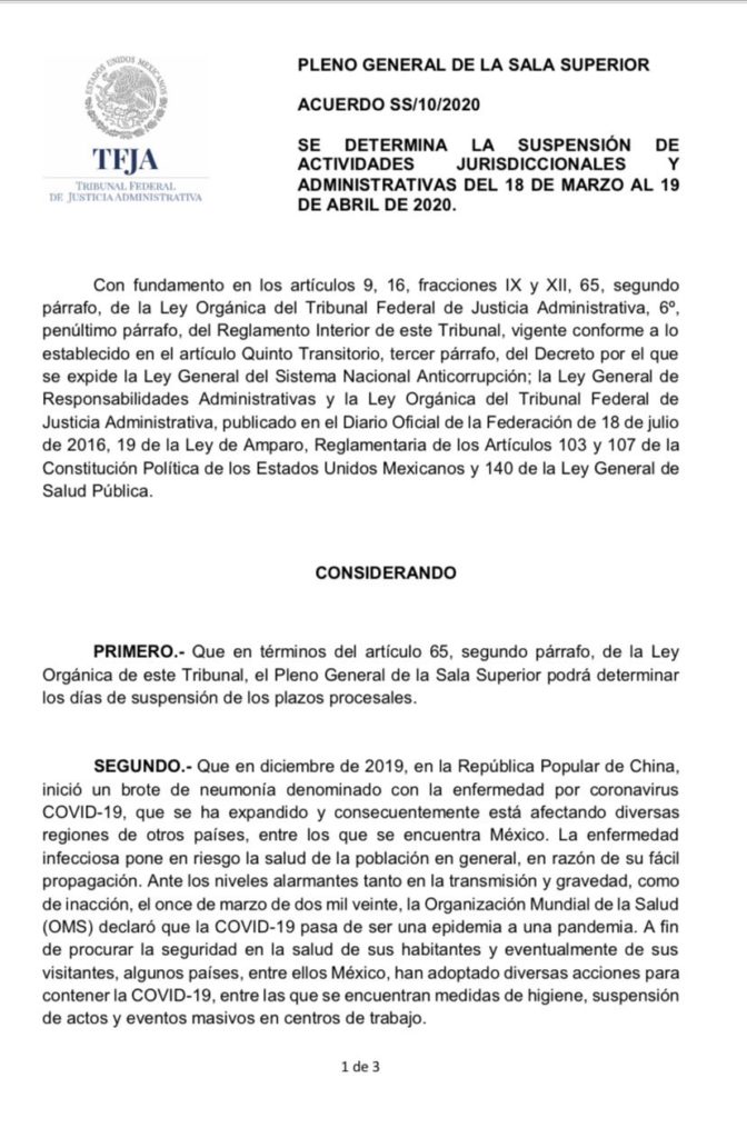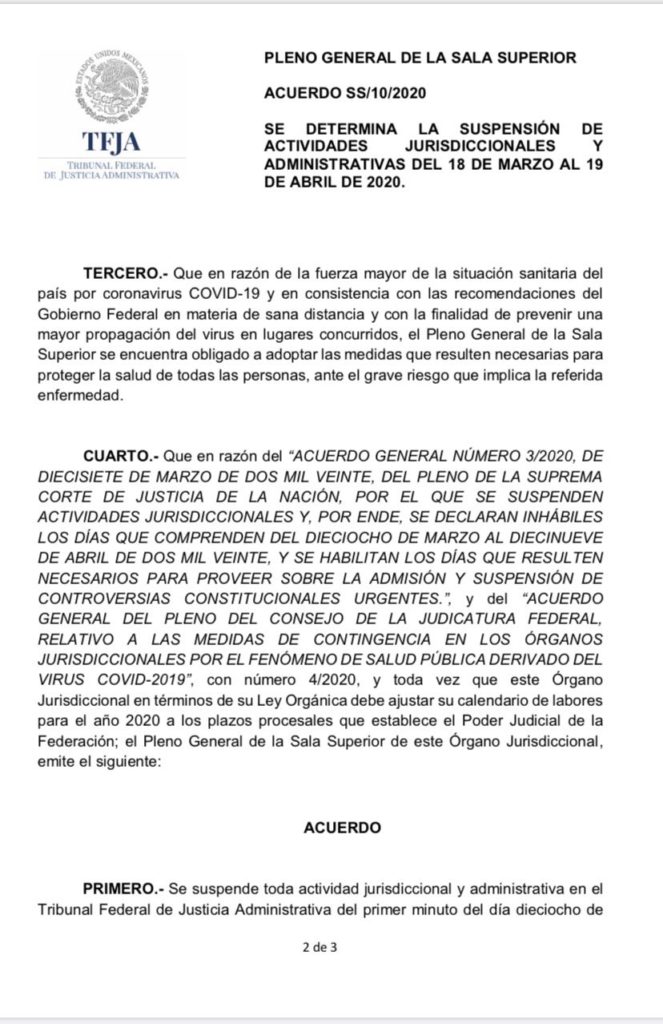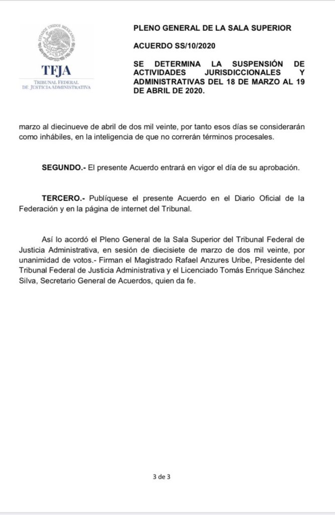 El Presidente del Tribunal Federal de Justicia Administrativa, hizo el anuncio oficial de suspensión de toda actividad tanto jurisdiccional como administrativa a partir del martes 18 de marzo y hasta el domingo 19 de abril, inclusive, para cumplir así con el acuerdo que en sesión extraordinaria aprobó el Pleno General de la Sala Superior de nuestro Tribunal, que con esta y otras medidas previamente anunciadas hará frente a la pandemia del COVID-19, para salvaguardar la salud e integridad física de los justiciables, los servidores públicos del TFJA y sus familiares.